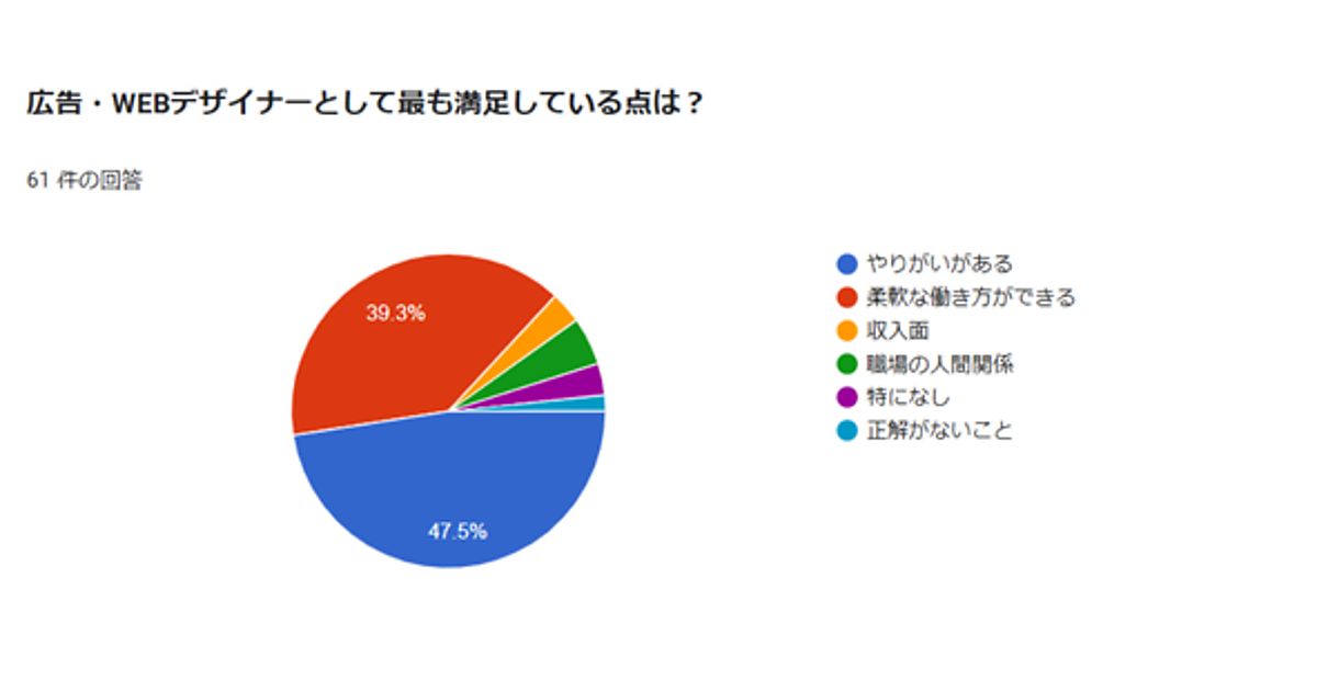 「広告・Webデザイナーとしてもっとも満足している点」では、「やりがいがある」をあげた人が47.5%で最多。「柔軟な働き方ができる」39.3%が上位。「職場の人間関係」4.9%、「収入面」は3.2%にとどまった一方で「正解がないこと」をあげた人も1.6%(1名)いた。やりがいにおいては“働き方の自由度”が重視されているようだ。具体的な意見としては「自分が手掛けた制作物が、公共の場など実際に人の目に触れている」「クライアントの利益に繋がった」「大きな売上を記録した」といった声が多いようだ。