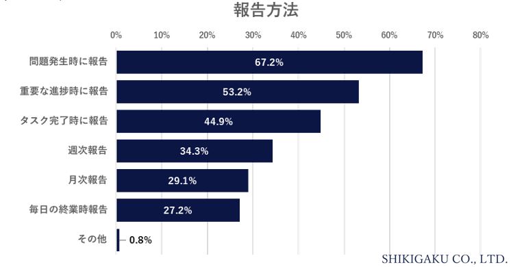 「報告方法」については、「問題発生時に報告」67.2%、「重要な進捗時に報告」53.2%、「タスク完了時に報告」44.9%が上位で、タスクドリブンな報告が上位。「週次報告」34.3%、「月次報告」29.1%など定期報告は低い。なお「報告のフォーマット」について聞くと、「定まっている」としたのはわずか11.7%。「テンプレート」「サマリーシート」「報告シート」といった回答が多い。