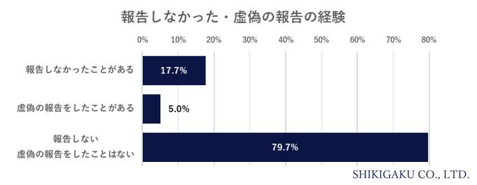 さらに「上司もしくは管理者への報告をしなかったり、虚偽の報告をしたことはああるか」を聞くと、「報告しなかったことがある」17.7%で、「虚偽の報告をしたことがある」5.0%と、計2割以上。「自分で処理できると思った」といった自己判断、「怒られるのが嫌でごまかした」といった報告することへの恐怖、「上司に報告しても対処されない」とあきらめの境地も示された。