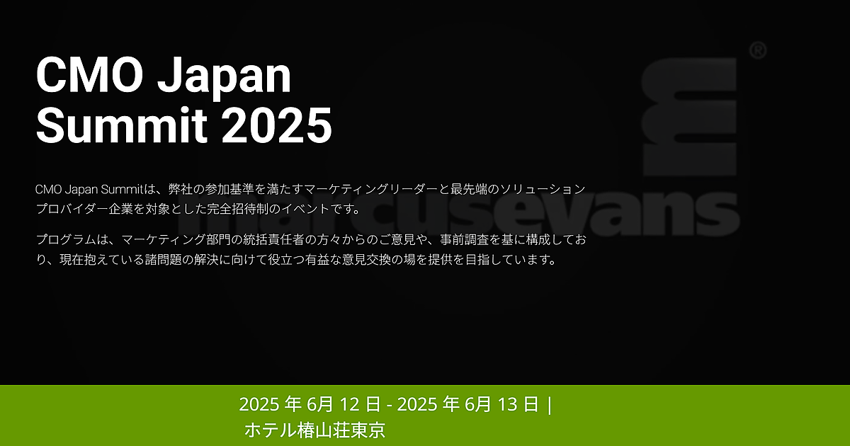 一流のマーケティングリーダーと最先端のソリューションプロバイダーが集結する完全招待制イベント「CMO Japan Summit 2025」が、2025年6月12日(木)・13日(金)の2日間、ホテル椿山荘東京で開催で開催される。主催はマーカス・エバンズ・イベント・ジャパン・リミテッド。現在抱えている諸問題解決に向けて有益な意見交換を行う場となる。