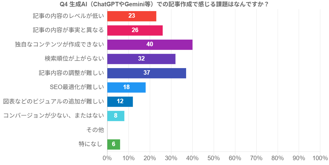 生成AIでの記事作成における課題としては、「独自なコンテンツが作成できないこと」が最も多く、ついで「記事内容の調整が難しいこと」が挙げられた。また、「検索順位が上がらない」という声も見られ、ある程度の人的な調整が必要であることがうかがえた。