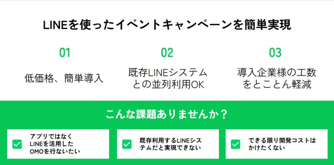 従来のLINEシステムでは体験型イベントのキャンペーン管理の実現が難しく、新たなアプリ開発には高額なコストがかかる課題があった。LINE de イベント+は新規のアプリ開発やシステム構築は一切不要で、LINE公式アカウントがあればそのままキャンペーンを開始でき、普段使い慣れたLINE上でスムーズなイベント体験を提供できる。
