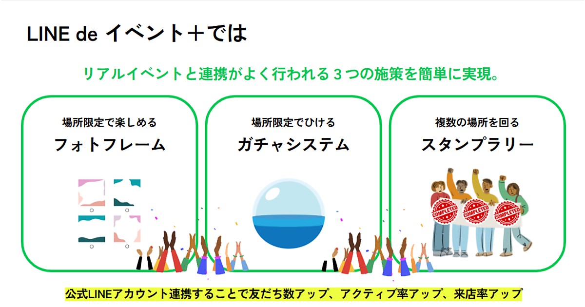 LINE de イベント+は、LINEでのキャンペーンに必要なサーバーや初期設定を代行し、最短4週間で本番運用できるのでスピードが求められる販促施策にも柔軟に対応できる。フォトフレームやガチャシステム、スタンプラリーなど複数の体験型コンテンツを、イベントの目的やユーザー層に合わせて柔軟に組み合わせることができる高い自由度がある。