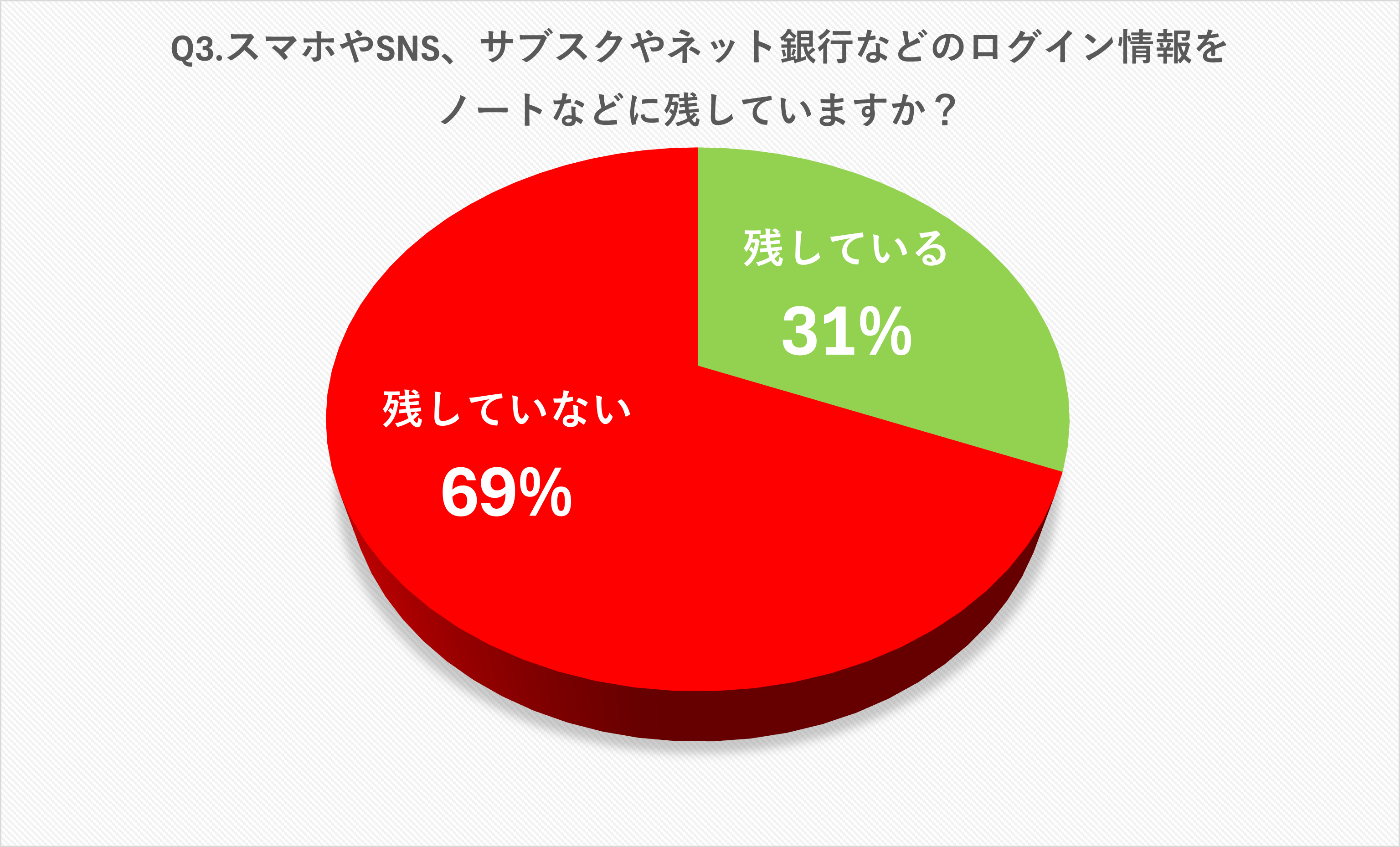 また「スマホやSNS、サブスクやネット銀行などのログイン情報をノートなどに残しているか」も、「残している」31%、「残していない」69%と、デジタル終活まで意識している人は少なそうだ。