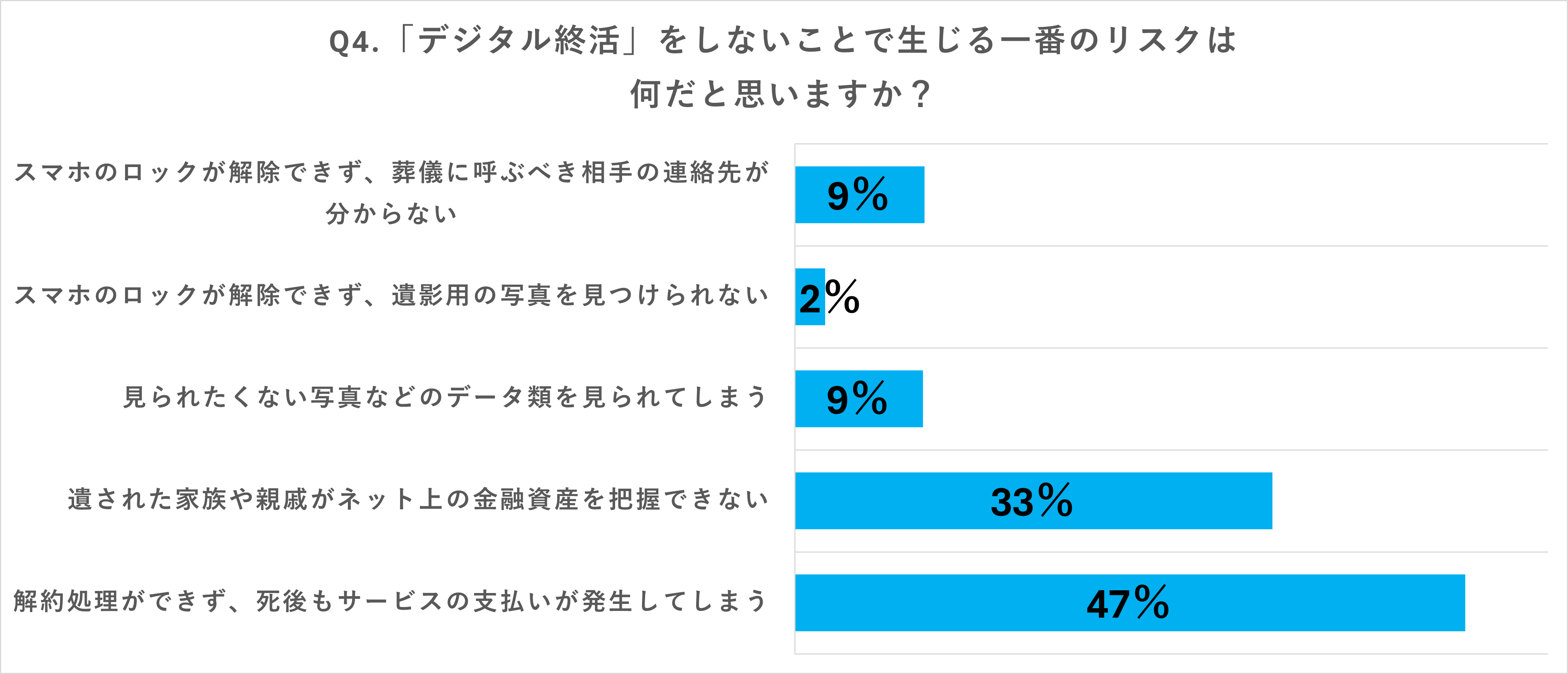 そこで、「デジタル終活をしないことで生じる一番のリスク」について聞いてみると、「解約処理ができず、死後もサービスの支払いが発生してしまう」47%、「遺された家族や親戚がネット上の金融資産を把握できない」33%が上位。「見られたくない写真などのデータ類を見られてしまう」「スマホのロックが解除できず、葬儀に呼ぶべき相手の連絡先が分からない」各9%という声もあがる。
