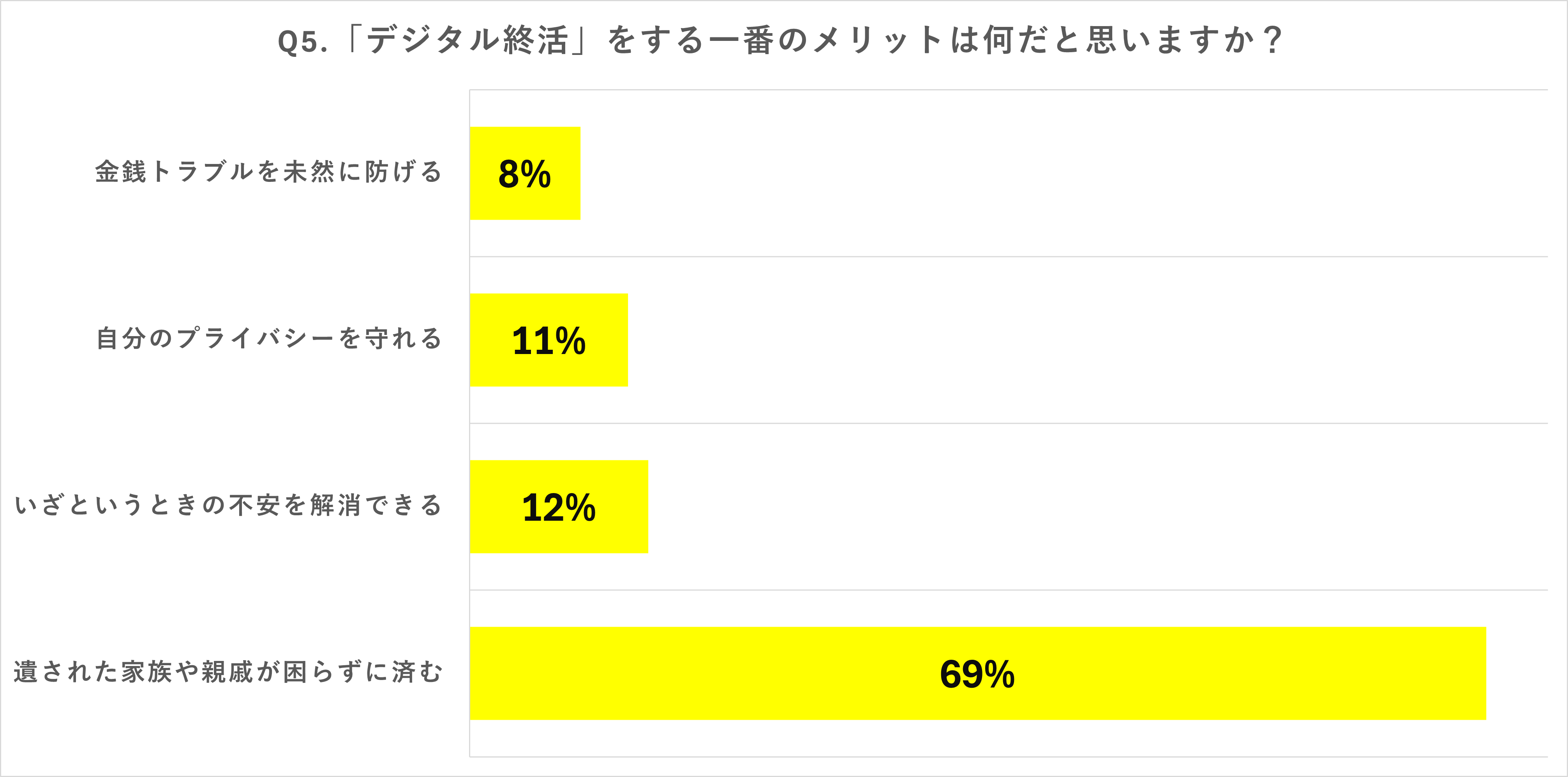 「デジタル終活をする一番のメリット」では、「遺された家族や親戚が困らずに済む」69%が特に多く、「いざというときの不安を解消できる」12%、「自分のプライバシーを守れる」11%、「金銭トラブルを未然に防げる」8%などアナログ終活と変わらない事情がうかがえる。