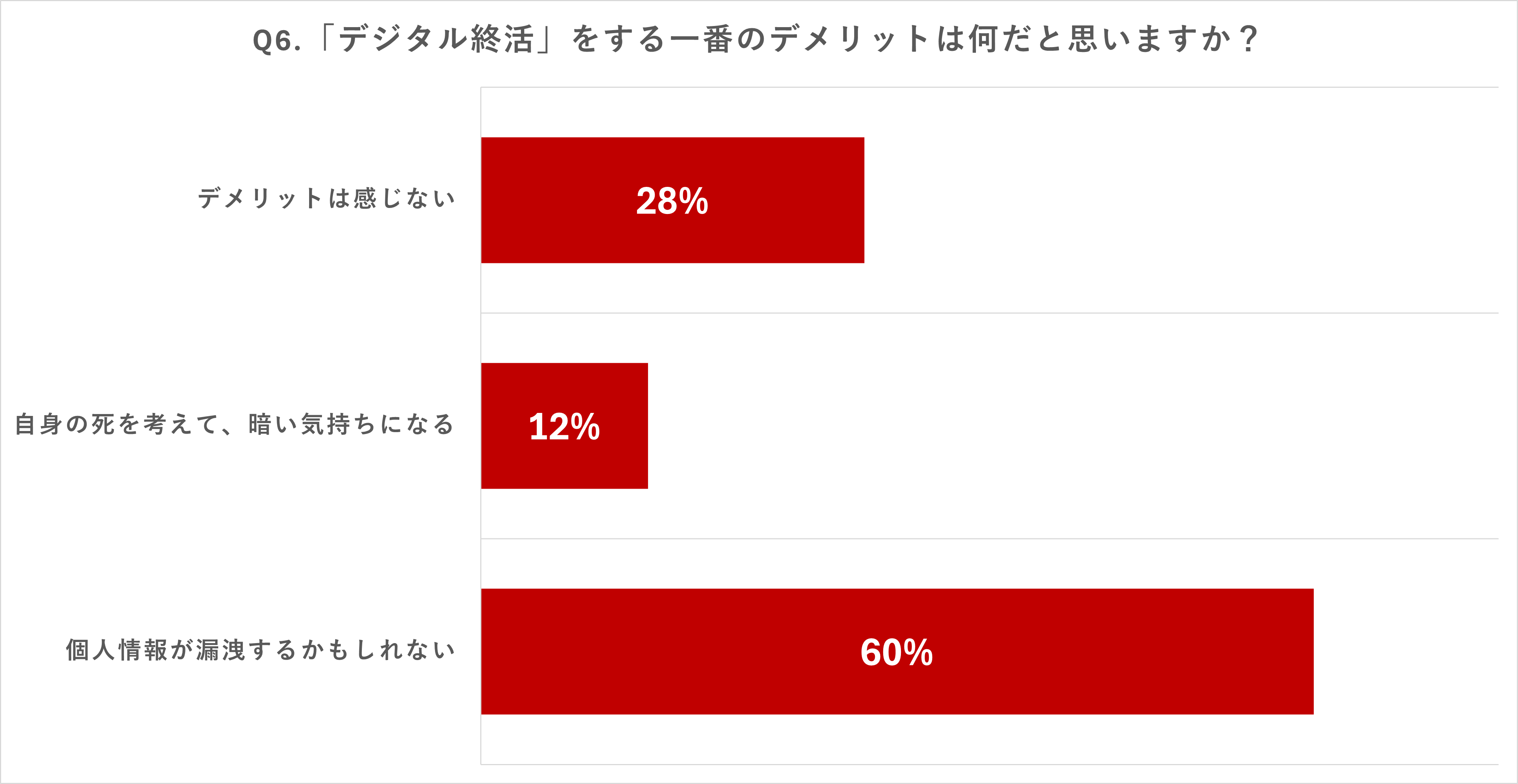 逆に「デジタル終活をする一番のデメリット」では、「個人情報が漏洩するかもしれない」60%が特に多いが、「デメリットは感じない」28%も多い。実際には適切なデータ管理は情報漏洩を防ぐことにつながるので、むしろふだんからの情報整理が重要だと考えられる。「自身の死を考えて、暗い気持ちになる」12%も一定数いるのは心情的に仕方ないところだろう。