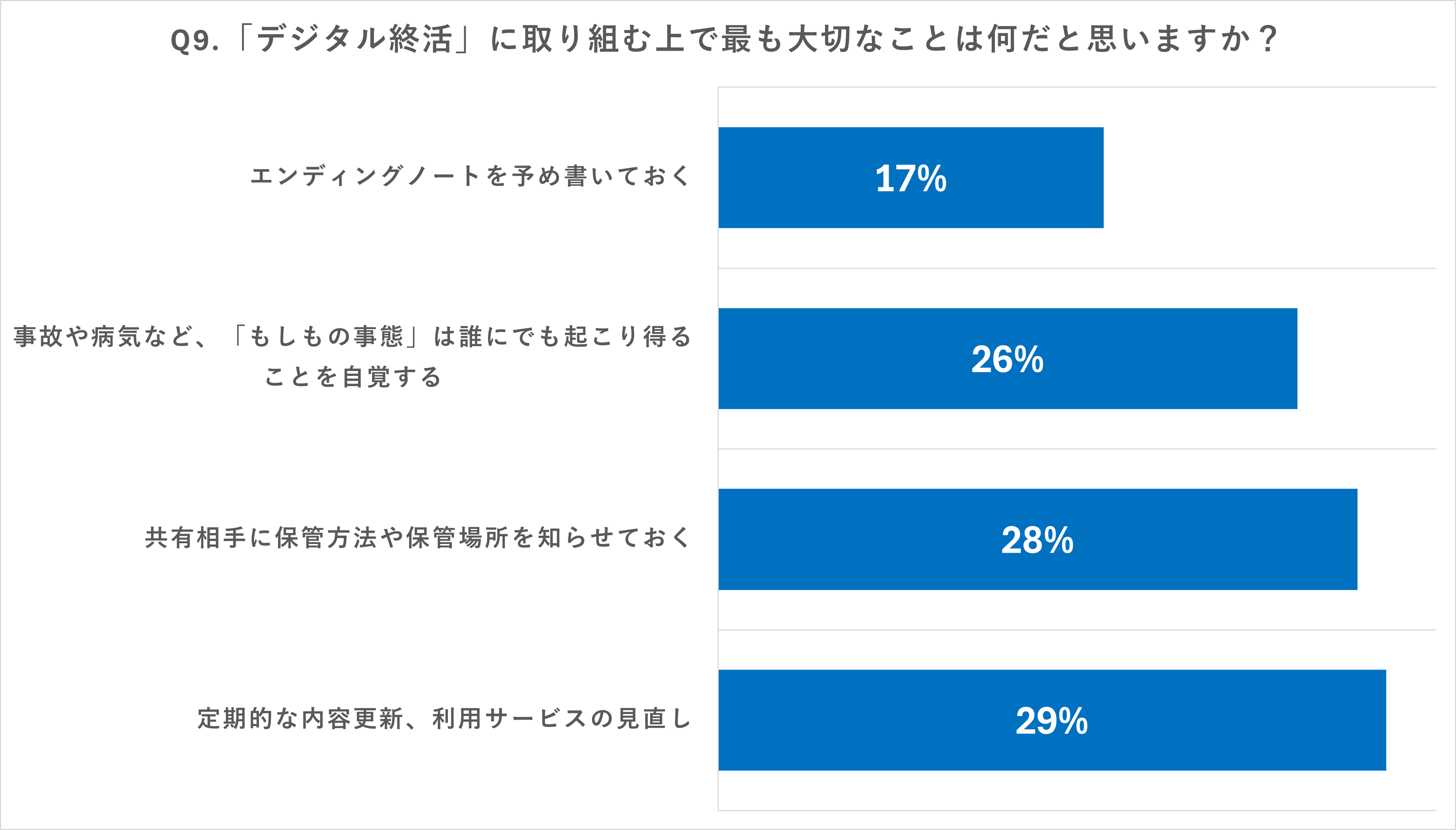 なお、自分の想いや大切な情報をあらかじめ書き残しておく「エンディングノート」について「知っている」とした人は81%。「今後デジタル終活」に取り組みたい」とした人は85%だった。また「デジタル終活に取り組む上で最も大切なこと」については、「定期的な内容更新、利用サービスの見直し」29%、「共有相手に保管方法や保管場所を知らせておく」28%、「事故や病気など、もしもの事態は誰にでも起こり得ることを自覚する」26%が上位だった。