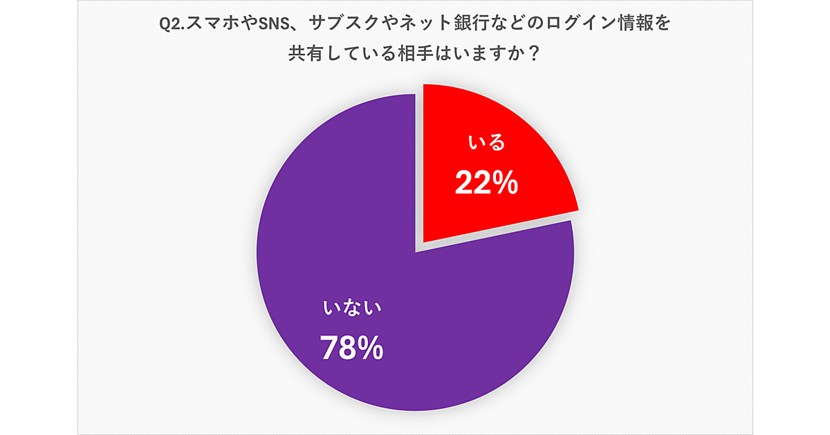 具体的に「スマホやSNS、サブスクやネット銀行などのログイン情報を共有している相手はいるか」と聞くと、「いる」22%、「いない」78%となった。デジタル終活を実践している人が少ないことに加え、個人情報や機微情報が含まれるため情報共有されていないことが多いようだ。