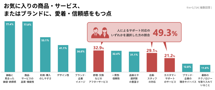 商品・サービスに愛着・信頼感を抱く要素としては、「価格に見合った価値・納得感」と「商品・サービスの品質・機能性」が上位2つとなった。また、「アフターサービス」「スタッフの対応」「カスタマーサポートのサービス」など、人によるサポート対応に関する項目のいずれかを選んだ割合は、全体の約半数にのぼった。