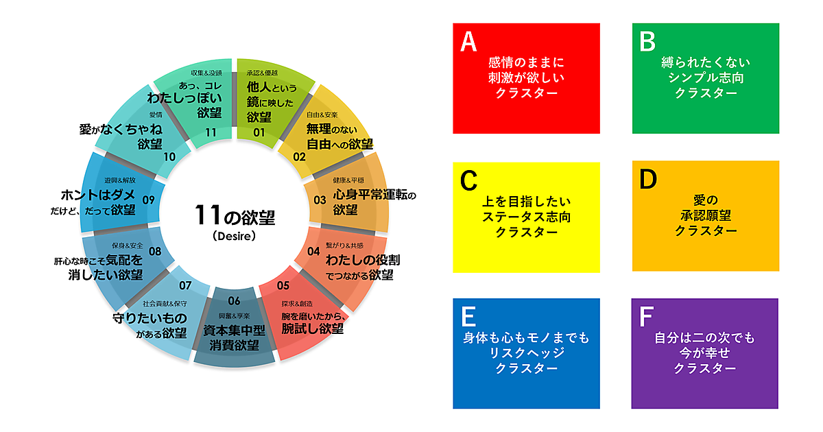 人間の消費行動に強く影響を及ぼす感情を分析した「11の欲望(2024年版)」をもとに開発した。11の欲望をもとに分類した6つの欲望クラスターは、(A)感情のままに刺激が欲しいクラスター、(B)縛られたくないシンプル志向クラスター、(C)上を目指したいステータス志向クラスター、(D)愛の承認願望クラスター、(E)身体も心もモノまでもリスクヘッジクラスター、(F)自分は二の次でも今が幸せクラスター。