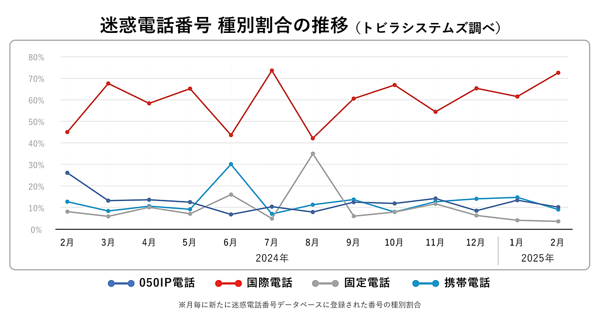 2025年2月に新たにトビラシステムズの迷惑電話番号データベースに登録された電話番号は、国際電話番号が72.6%(前月比+11.0%)で、前月から増加。特定IP電話番号(050番号)、固定電話番号、携帯電話番号の割合は横ばい傾向で推移している。