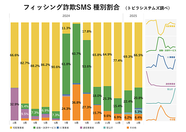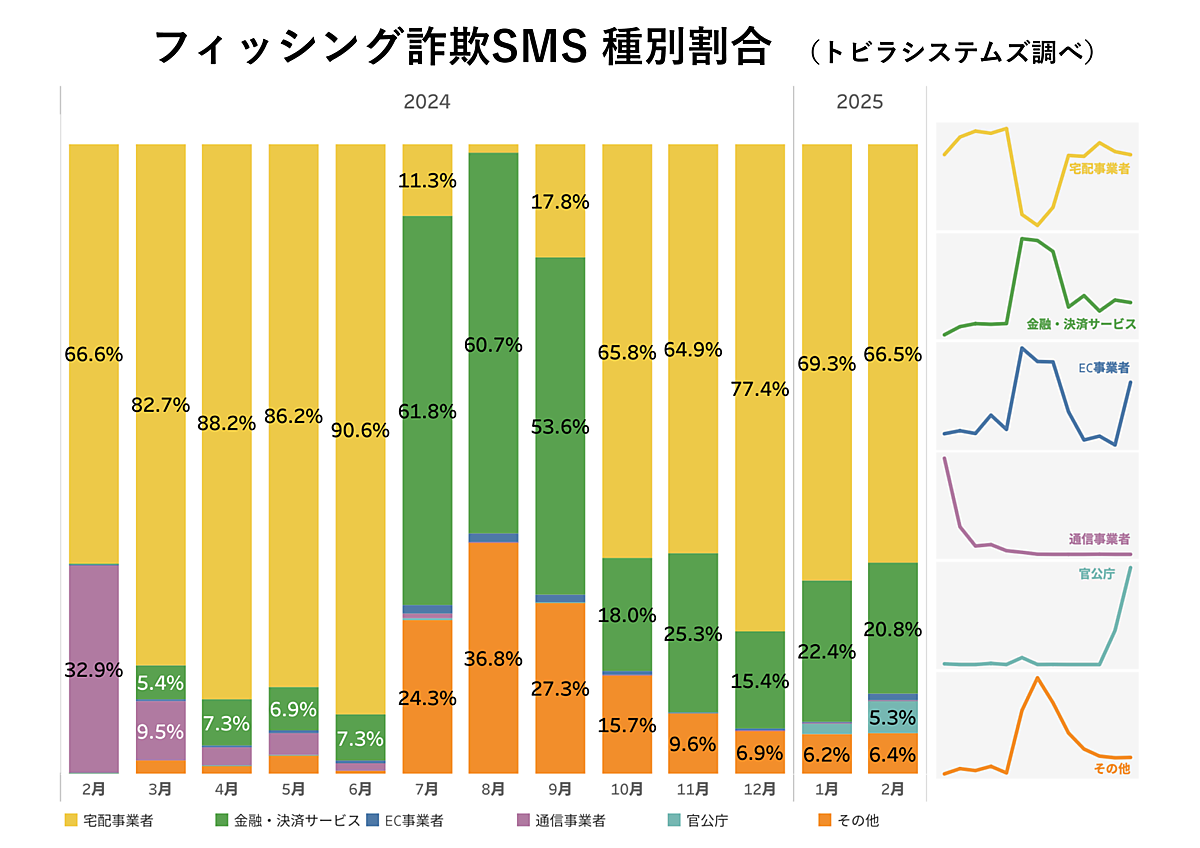 SMSの動向を見ると、2025年2月に確認されたフィッシング詐欺SMSは、宅配事業者を騙るものが66.5%と大多数。金融・決済サービスを騙るものが20.8%と続いた。