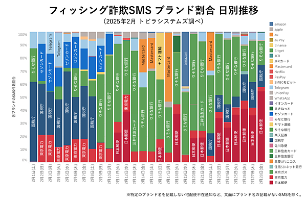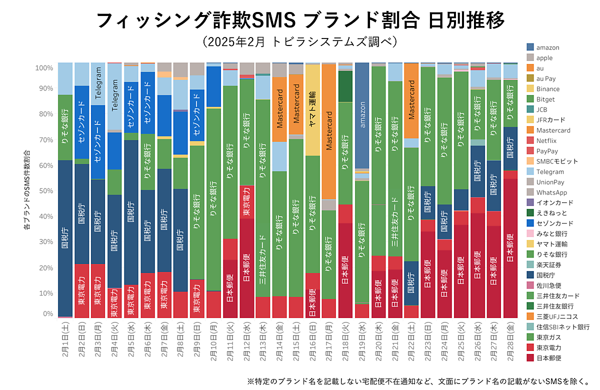 さらに実在する企業やブランドを騙る詐欺SMSを見ると、確定申告シーズンということもあり、2月上旬・下旬に「国税庁」を騙るSMSが多く発生した。