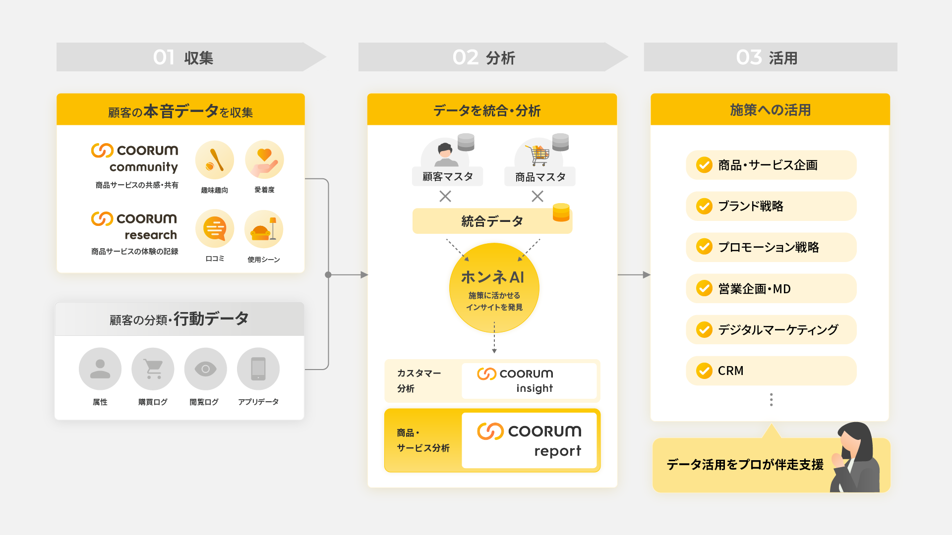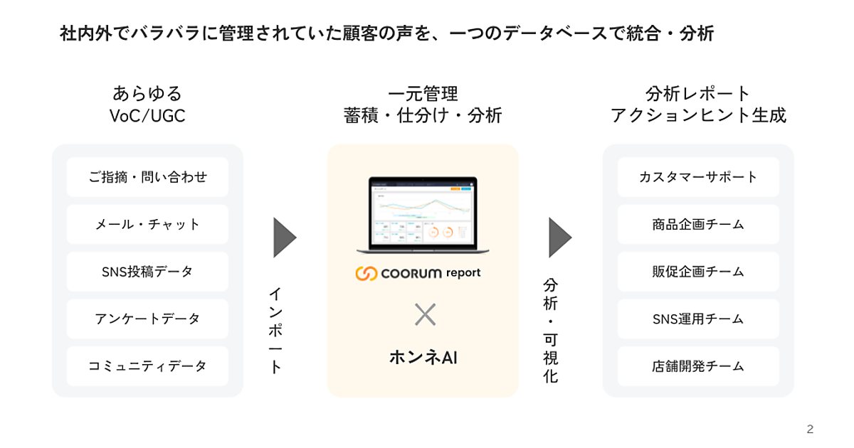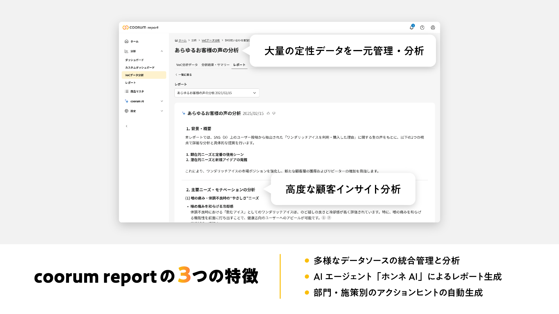 coorum reportは、coorumシリーズの中でデータの活用領域に踏み込んだプロダクトで、社内外にバラバラに管理された顧客の声など多様なデータを1つのデータベースに統合して管理し、定性データの顧客の声を定量的に評価したレポートをホンネAIが生成する。商品企画、販促企画、営業シーンでの活用、店舗開発、PR、プロモーション、SNS運用など各部門や施策別に新たな「気づき」と「アクションヒント」を自動生成する。