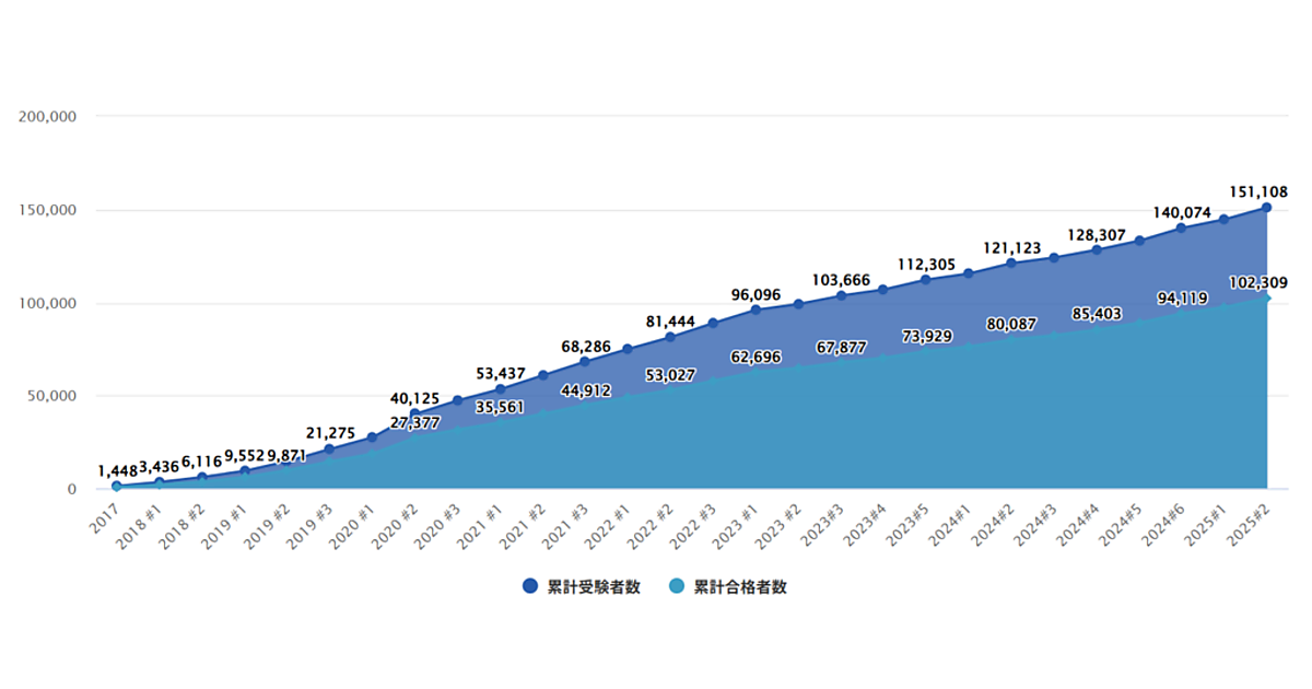 同協会は2017年6月に設立。AI研究の第一人者とされる東京大学の松尾豊教授が理事長を務める。G検定は、AI・ディープラーニングの正しい理解と実装を広めるため2017年12月に始まった。初回の試験は1448人が受験し、823人が合格。受験者はその後増え続け、2020年には合格者が3万人を突破。3月の2025年第2回G検定で合格者数10万人を達成した。