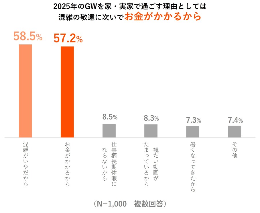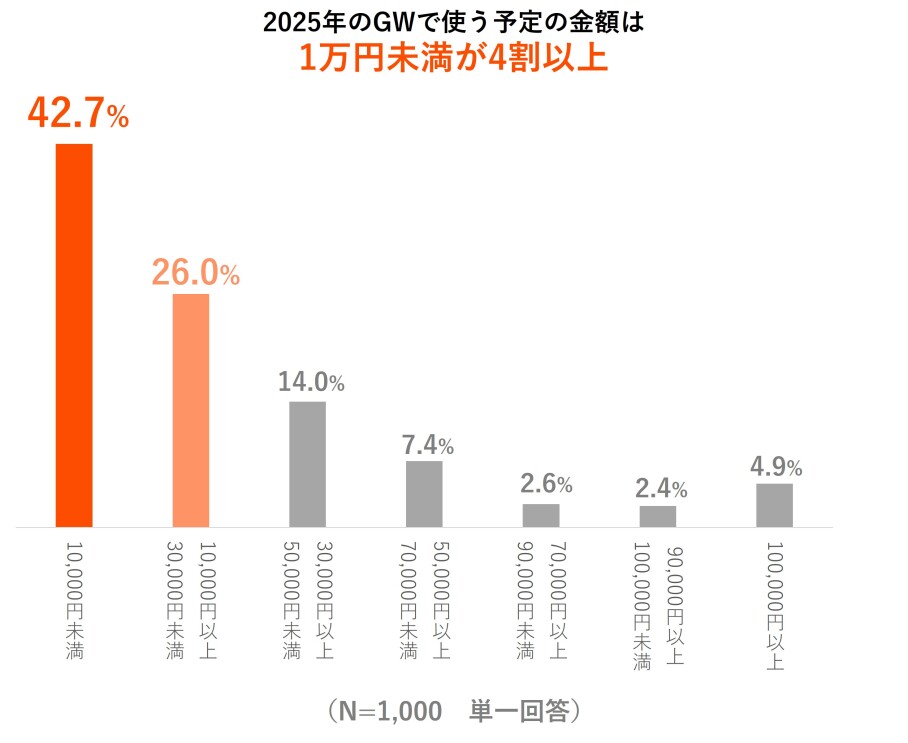 「家・実家で過ごす」という698人にその理由を聞くと、「混雑がいやだから」58.5%、「お金がかかるから」57.2%がトップ2でほぼ並ぶ。そこで「ゴールデンウィークに使う予定の金額」についても聞くと、「10,000円未満」42.7%が圧倒的に多く、「10,000円以上~30,000円未満」26.0%とあわせると、30,000円未満に抑える人が7割を超える。