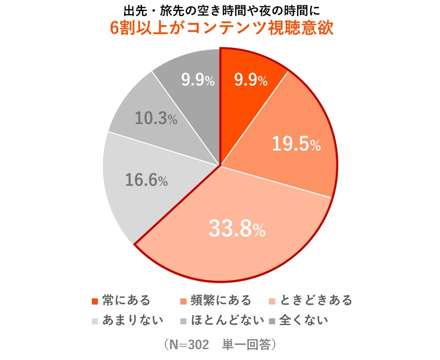 さらに「出かける・旅行する」と回答した302人にコンテンツ視聴意欲について聞くと、63.2%が「出先・旅先での空き時間や夜の時間にコンテンツを視聴したくなることがある」と回答している。動画視聴が習慣化している様子がうかがえる。