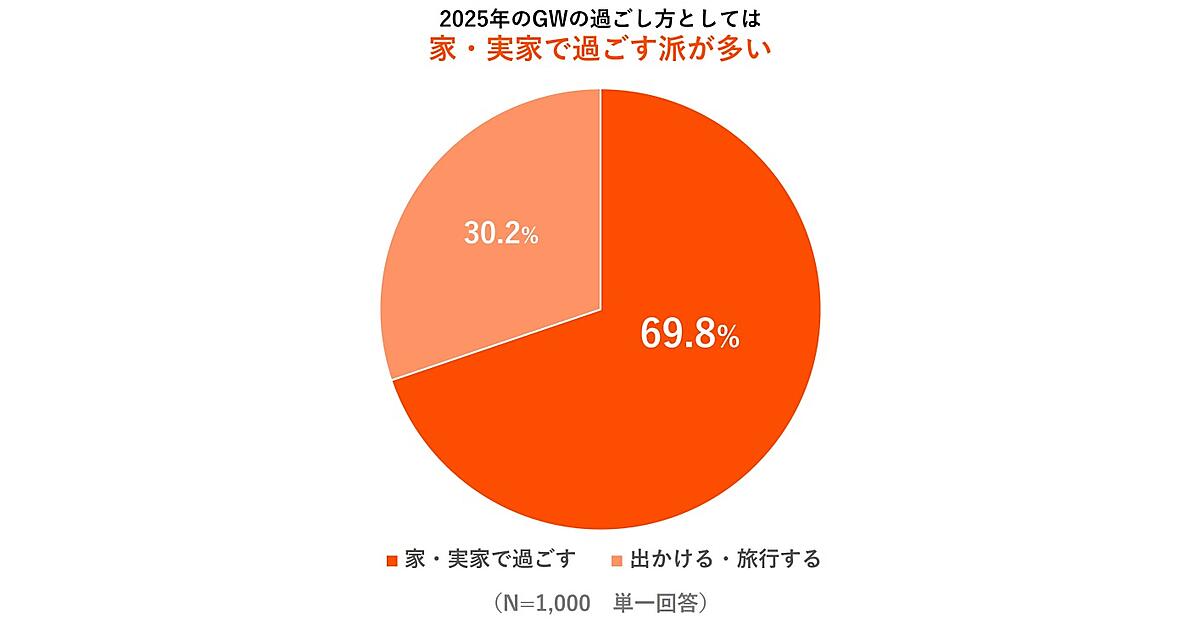 まず「今年2025年のゴールデンウィークの過ごし方」を聞くと、「家・実家で過ごす」69.8%が「出かける・旅行する」30.2%を大きく上回った。