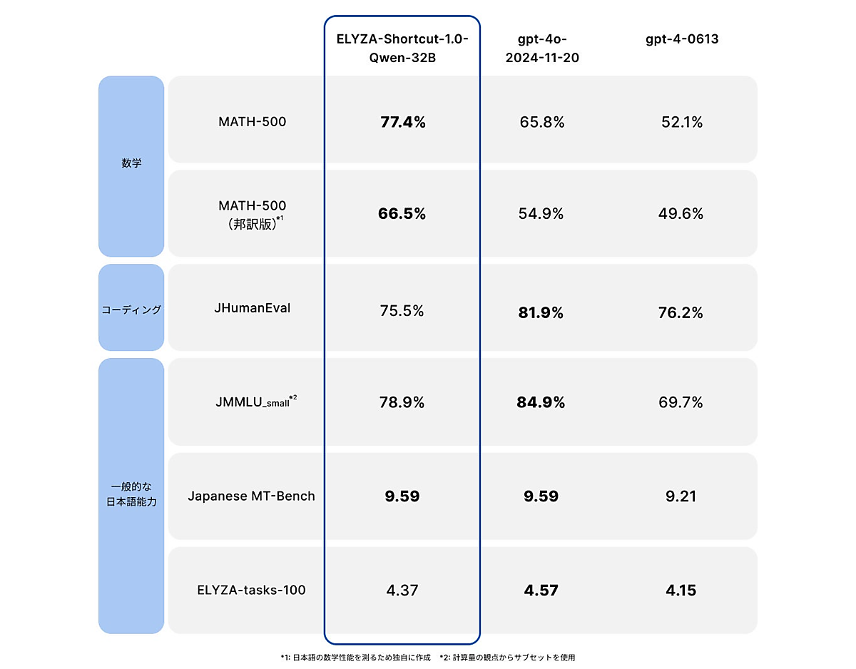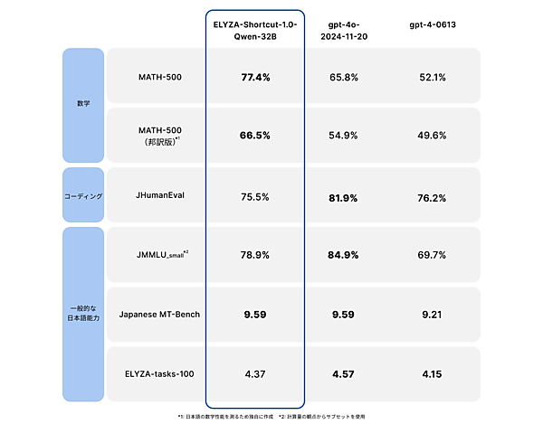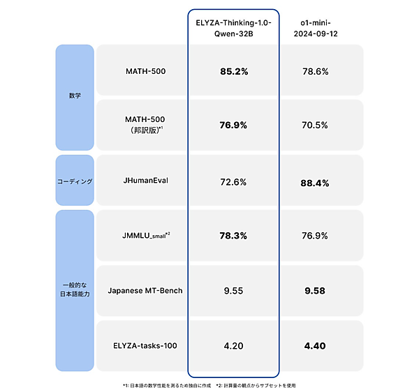 米国OpenAIの「o1/o3」シリーズ、中国DeepSeekの「DeepSeek-R1」と同様のReasoning Model。思考の連鎖(Chain of Thought)=CoT=と呼ぶ手法を使い、問題を段階的に処理して回答を生成する。ELYZA-Thinking-1.0-Qwen-32Bは、比較的軽量な320億パラメータのモデルだが、OpenAIの「o1-mini」に近い性能を達成。特に数学系のベンチマークのスコアでは上回った。