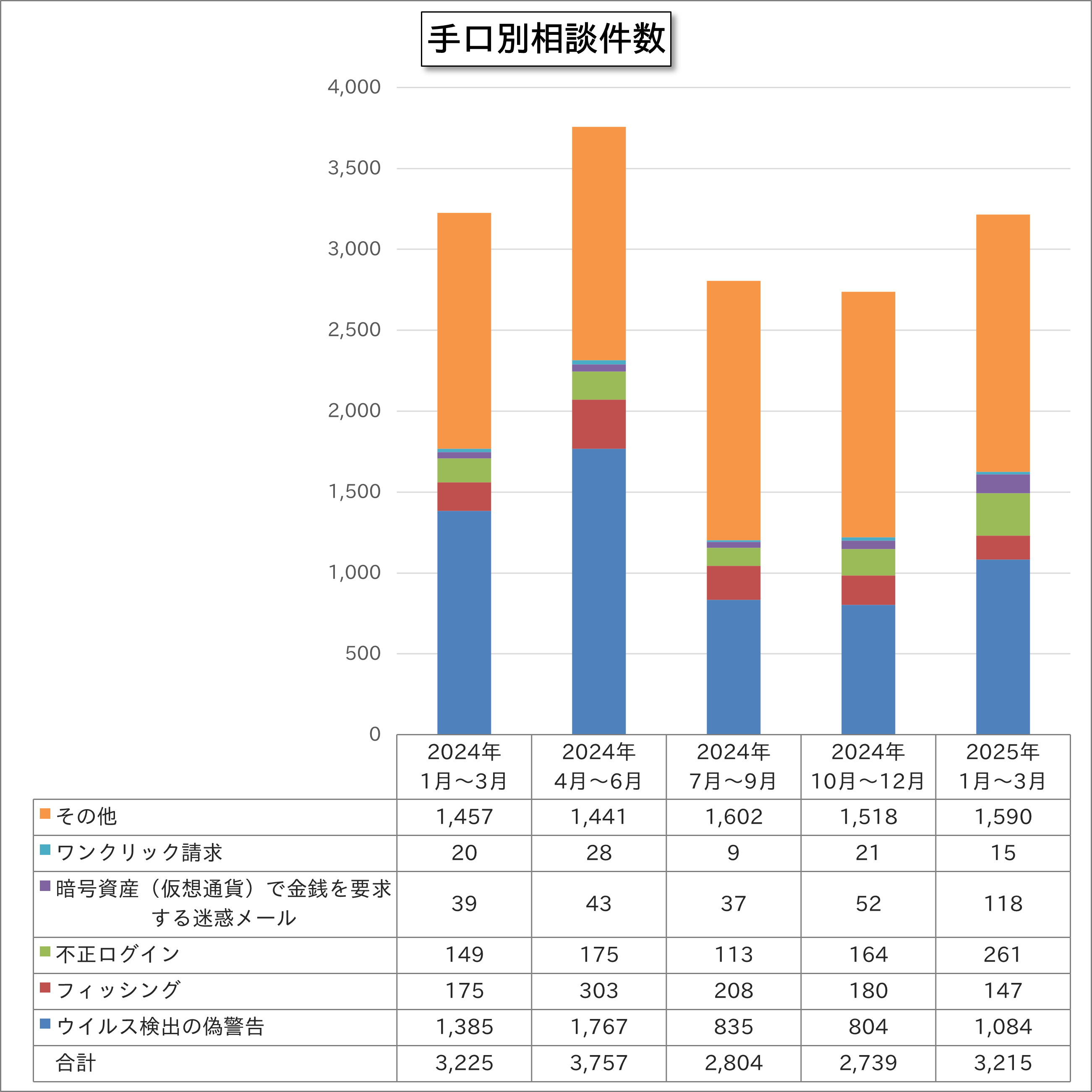 そして手口別でみると、「ウイルス検出の偽警告」1,084件(構成比33.7%)がもっとも多く、以下「不正ログイン」261件(同8.1%)、「フィッシング」147件(同4.6%)、「暗号資産(仮想通貨)で金銭を要求する迷惑メール」118件(同3.7%)、「ワンクリック請求」15件(同0.5%)が続いた。前四半期と比較すると「不正ログイン」「ウイルス検出の偽警告」の件数増加が目立つ。