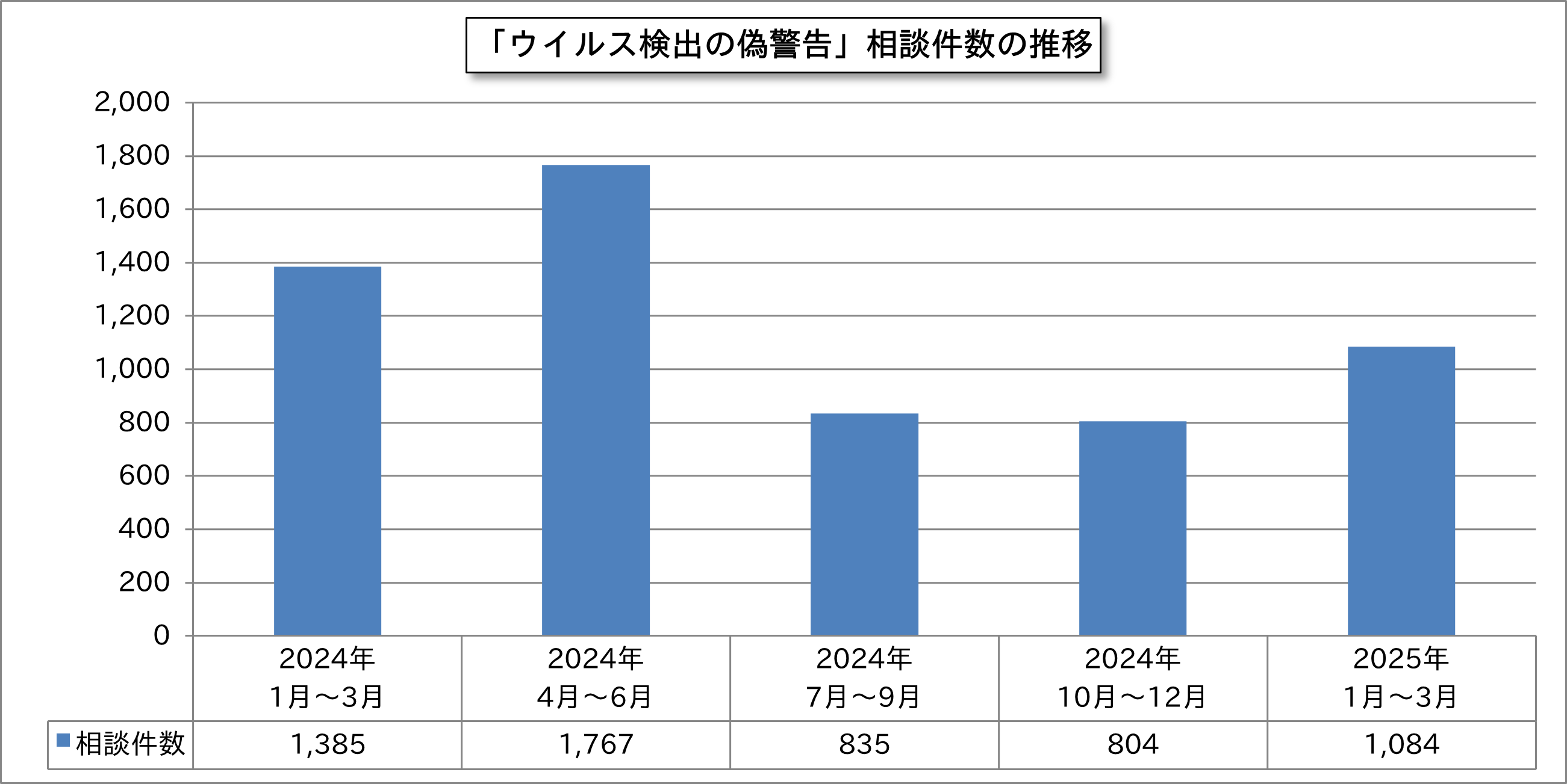 「ウイルス検出の偽警告」については、前四半期から約34.8%増の1,084件。スマートフォンに遠隔操作アプリをインストールさせられ、不正送金をされる相談が増えているという。