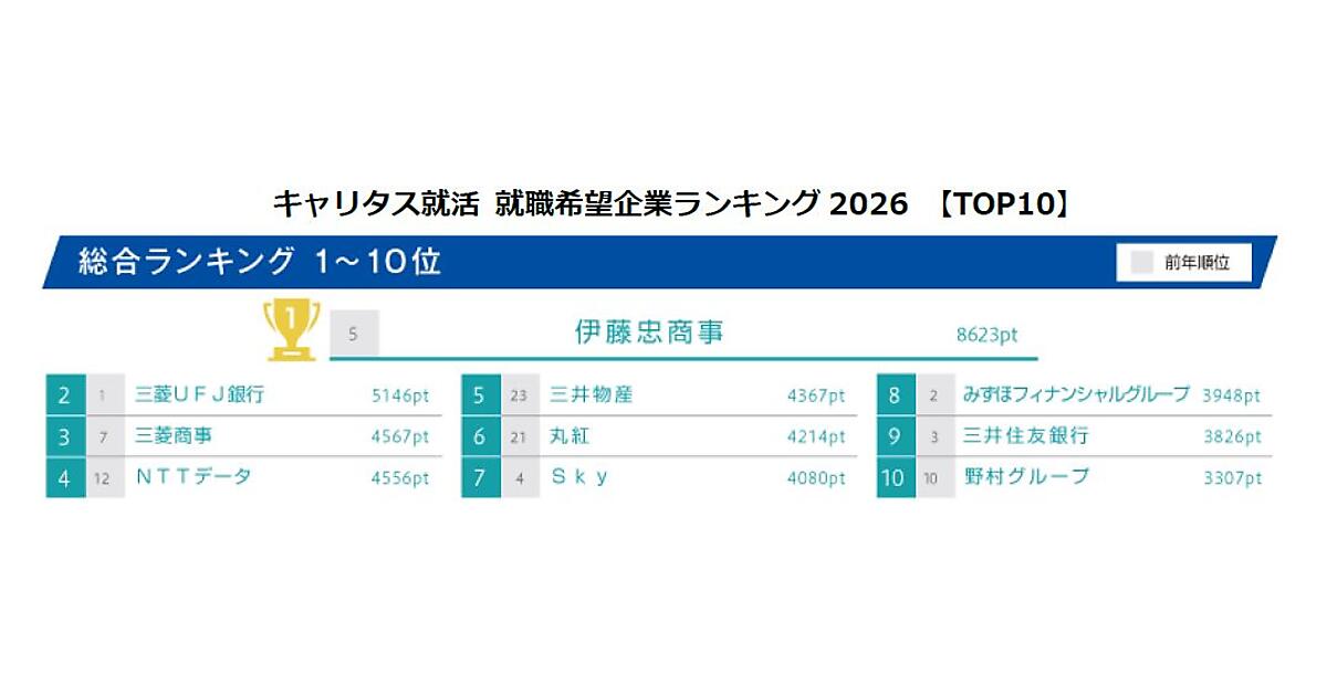 キャリタスは、「就職希望企業ランキング2026」(総合/大学院生/文理別/本社所在地エリア別/業種別/学校群別など)に関する調査結果を発表した。2026年卒業予定の学生10,261人が回答している。