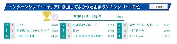 一方、インターンシップ・キャリアに参加した学生が選んだ企業は、1位「三菱UFJ銀行」、2位「ニトリ」、3位みずほフィナンシャルグループ」で、前年と同順だった。