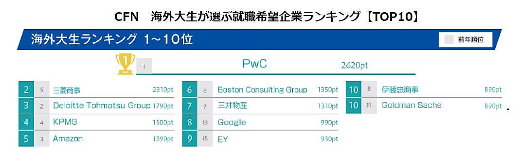 なお海外大生が選んだ企業では、世界4大会計事務所の1つである「PwC(プライスウォーターハウスクーパース)」が1位。2位「三菱商事」、3位「Deloitte Tohmatsu Group」が続いた。