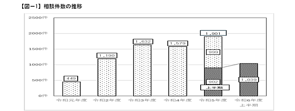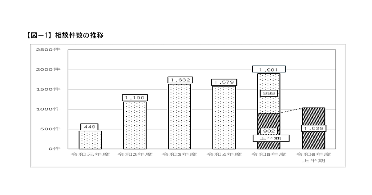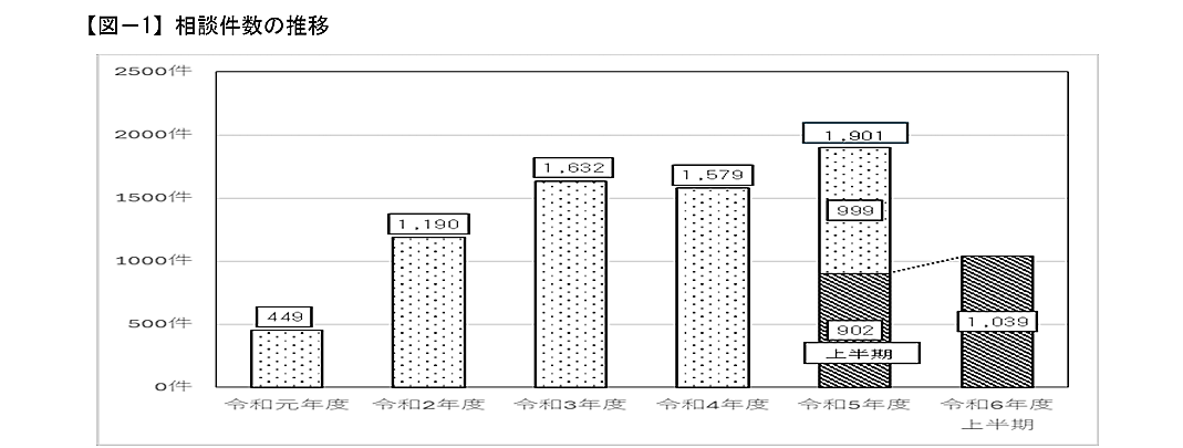 相談件数は、令和5年度に1,901件と令和元年度の449件と比較すると423.4%と激増。令和6年度上半期も1,039件と、前年同期の902件と比較して、115.2%の増加となっている。