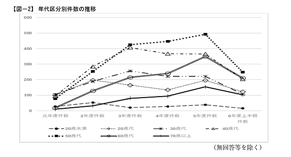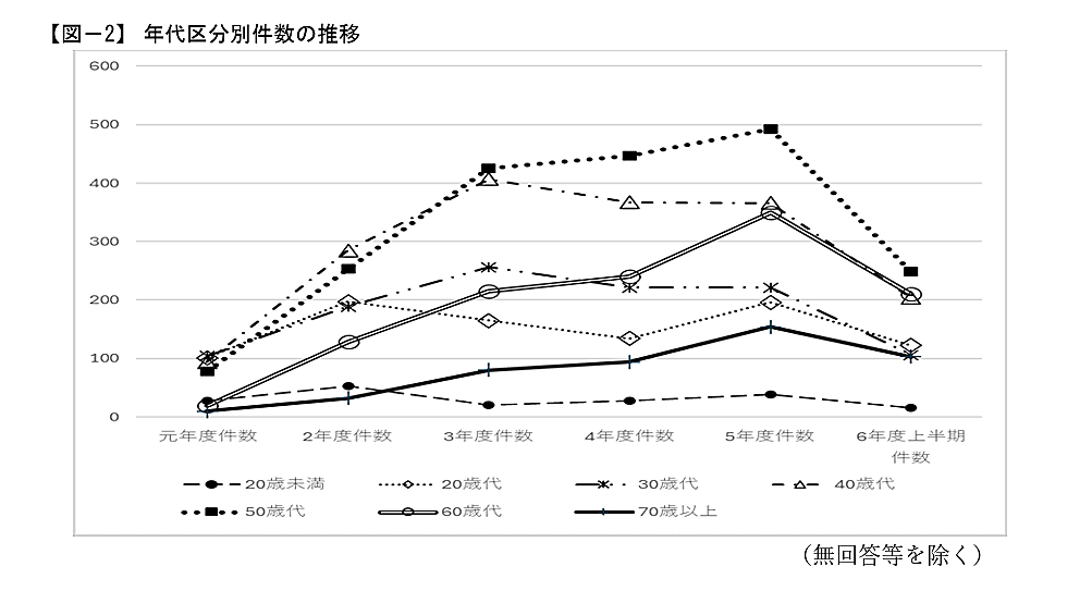 年代別にみると、令和6年度上半期で最も相談件数が多いのは50歳代(249件)であり、次いで60歳代(210件)、40歳代(204件)となっている。傾向として、50歳以上で令和元年度から令和5年度にかけて毎年増加している。