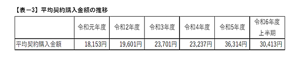 契約購入金額別の割合をみると、金額不明を除く相談のうち、5万円未満の相談件数が90%以上を占めている。平均契約購入金額をみると、令和6年度上半期は30,413円であり、令和元年度から令和5年度にかけて、おおむね増加傾向にある。
