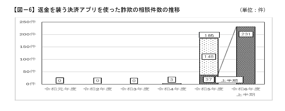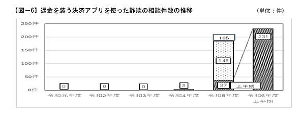 これは、商品の欠品などを理由に決済アプリで返金すると偽り、さらに送金させる手口が増えているためである。この手口による被害の相談件数は、令和5年度に前年度比60倍以上と激増し、令和6年度上半期も231件と、前年度同期比624.3%となっている。