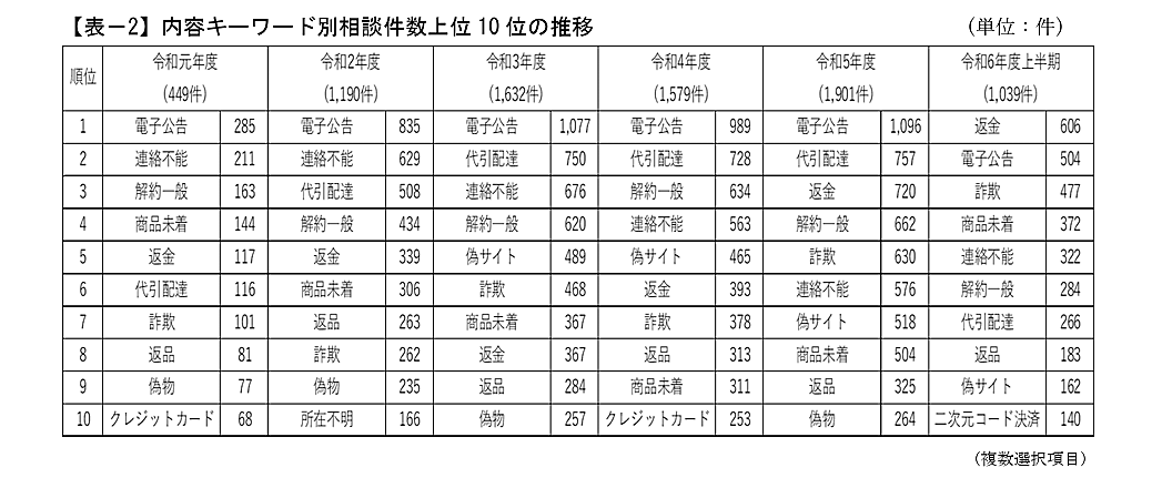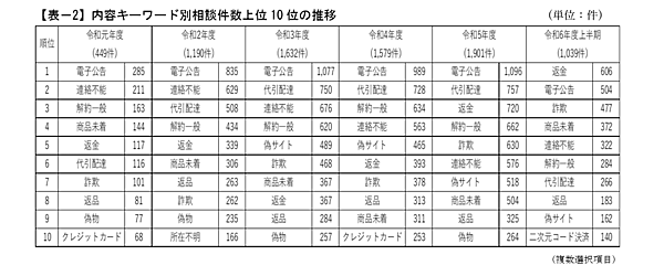 上位10位中の増加率でみると、第10位の「二次元コード」(140件、前年度同期比1,000.0%)、第1位の「返金」(606件、前年度同期比219.6%)、第3位の「詐欺」(477件、前年度同期比185.6%)、第4位の「商品未着」(372件、前年度同期比170.6%)が大幅に増加している。