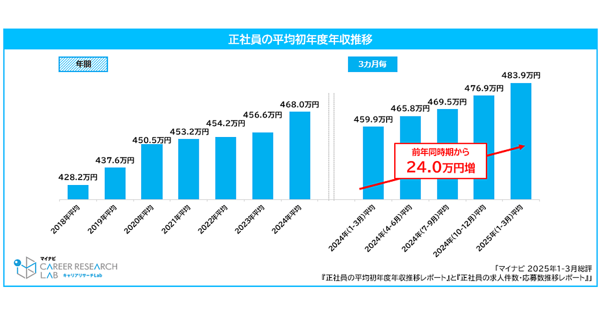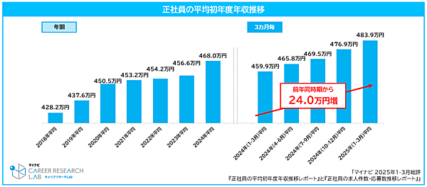 まず2025年1月~3月の正社員の平均初年度年収を見ると「483.9万円」。前年同時期の459.9万円から24.0万円増加し、2018年の調査開始以降最高値となった。