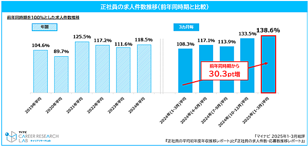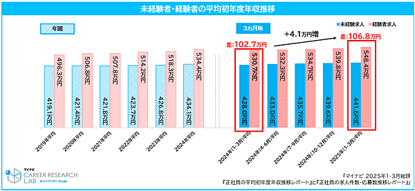 マイナビが運営する「マイナビ転職」は、「正社員の平均初年度年収推移レポート」と「正社員求人件数・応募数推移レポート」を発表した。総合転職情報サイト「マイナビ転職」に掲載された求人の「平均初年度年収(未経験・経験者求人別)」「求人件数・応募数」の推移を調査したもので、2025年1~3月の総評となっている。