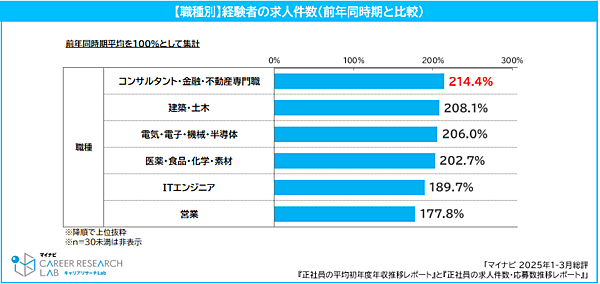経験者求人件数が増加した職種では「コンサルタント・金融・不動産専門職」214.4%、「建築・土木」208.1%、「電気・電子・機械・半導体」206.0%が上位で、ほぼ倍増している。