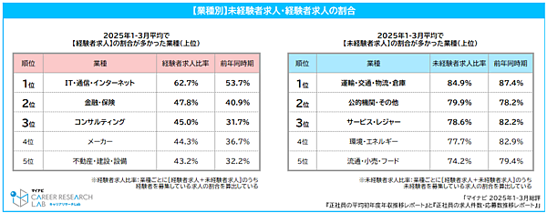 経験者求人が多い業種は「IT・通信・インターネット」62.7%、「金融・保険」47.8%、「コンサルティング」45.0%が上位。逆に未経験求人が多い業種は「運輸・交通・物流・倉庫」84.9%、「公的機関・その他」79.9%、「サービス・レジャー」78.6%が上位だった。