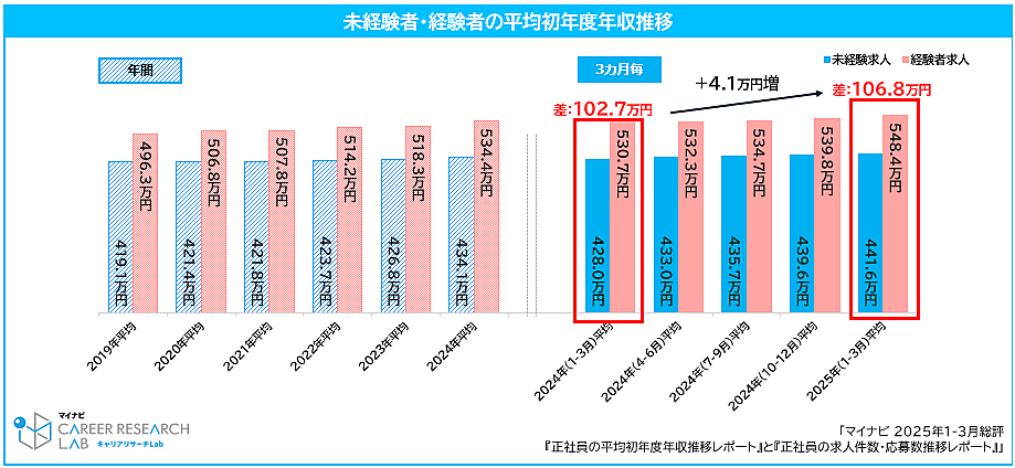 未経験者/経験者で見ると、未経験求人は「441.6万円」、経験者求人は「548.4万円」で106.8万円の差。差額は前年同時期より4.1万円増加しており拡大傾向にある。