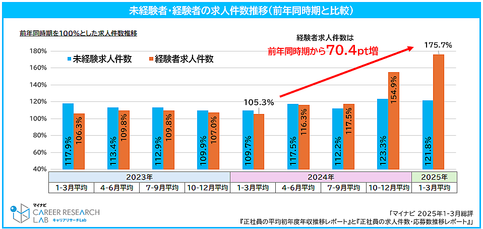 2025年1月~3月平均の求人件数は、前年同時期比138.6%と大きく増加。未経験求人と経験者求人を比較すると、未経験求人件数は前年同時期比で121.8%、経験者求人件数は175.7%で、やはり経験者求人が伸びている。