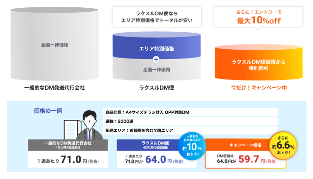 ラクスルDM便は印刷から配送までワンストップで提供するサービスで3月3日に開始。地区宅便の一都三県(東京、神奈川、埼玉、千葉)の配送網で業界最安級の価格で提供し、新たに関西エリアを加えた。利用条件は、配送エリアが全国(一都三県および関西エリアを含むこと)で、配送物は非信書のみ、配送物重量100グラム以内、最低配送通数500通。価格は1通56.1円(税抜)からで、ラクスル以外で印刷された印刷物の持ち込みもできる。