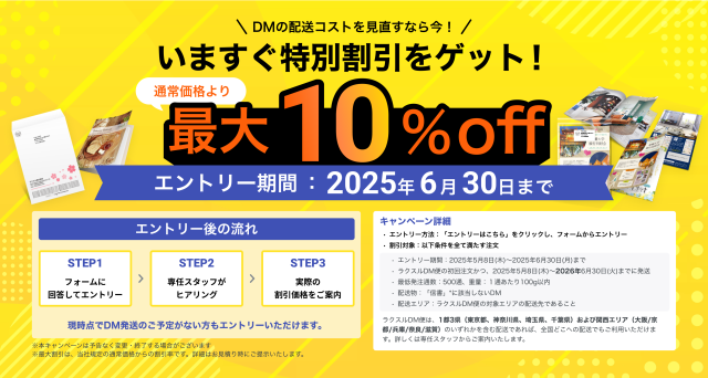 印刷・集客支援プラットフォーム運営のラクスルは、セイノーグループでエリア特化型メール便発送・配達事業の地区宅便によるダイレクトメール(DM)の新配送プラン「ラクスルDM便」を関西エリア(大阪、京都、兵庫、奈良、滋賀)へ拡大したと5月8日に発表した。ラクスルの低価格短納期印刷と、地区宅便のラストワンマイル配送網を組み合わせ、従来価格より10%のコストダウンを実現している。