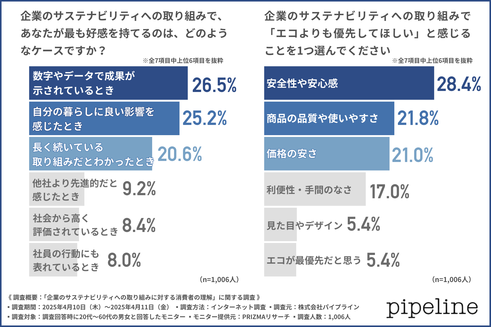 パイプラインは、「企業のサステナビリティへの取り組みに対する消費者の理解」に関する調査結果を発表した。企業のサステナビリティ(環境配慮、SDGs)などの取り組みについて、20代~60代の男女1,006人が回答している。