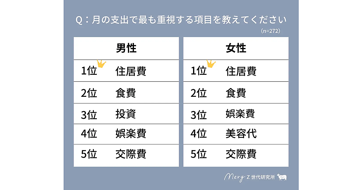 最後に、月の支出で最も重視する項目を男女別に聞くと、「住居費」「食費」が男女ともに1位、2位を占めた一方で、男性は3位に「投資」、女性は4位に「美容代」がランクインした。また、男女ともに上位の「娯楽費」には推し活等の趣味費用が含まれており、平均すると1万円近くがかけられていることがわかった。