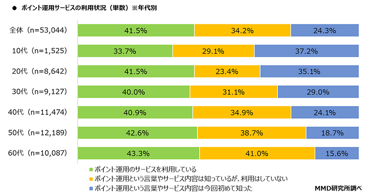 まず18歳~69歳の53,044人に、「ポイント運用サービス」「ポイント投資サービス」の認知や利用状況を聞くと、「ポイント運用サービス」の認知率は75.7%、利用率は41.5%だった。「ポイント投資サービス」の認知率は66.8%、利用率は18.4%とやや下がる。年代別では、ポイント運用サービスは認知・利用率ともに60代が最多、ポイント投資サービスは認知率トップは60代だが利用率は20代が最多だった。デジタルなポイントサービスが生活に密着しているだけに、20代は積極的なようだ。