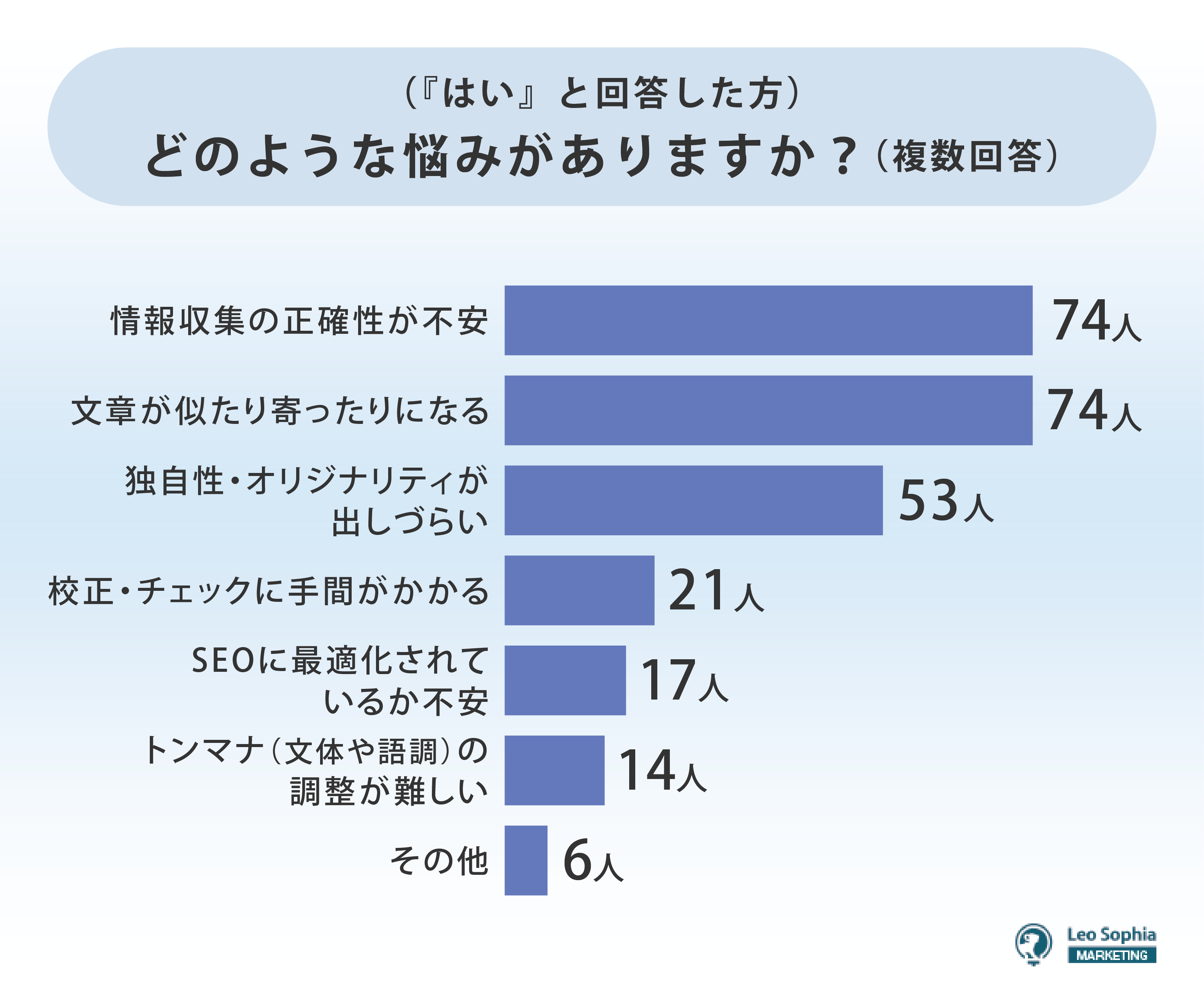 AIライティングを活用するうえで悩みや課題があるかという質問では、73.60%が「はい」と回答した。具体的にどのような悩みがあるかを聞くと、「情報収集の正確性が不安」「文章が似たり寄ったりになる」が56.49%で同率1位になった。