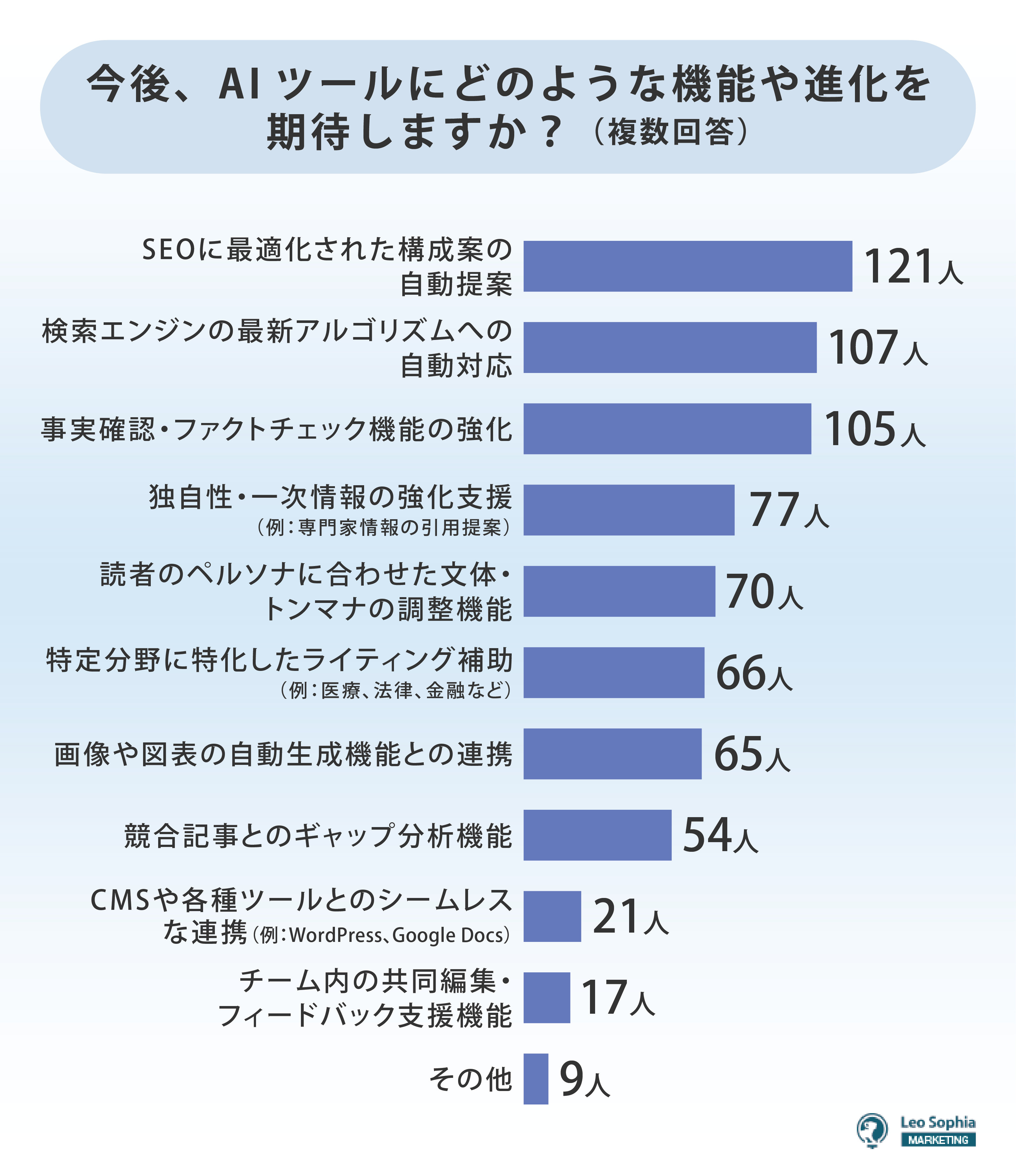 また今後、AIツールに対してどのような機能や進化を求めているかを聞くと、「SEO最適化構成案の自動提案」「検索エンジンの最新アルゴリズムへの自動対応」「事実確認・ファクトチェック機能の強化」が上位3つとなった。