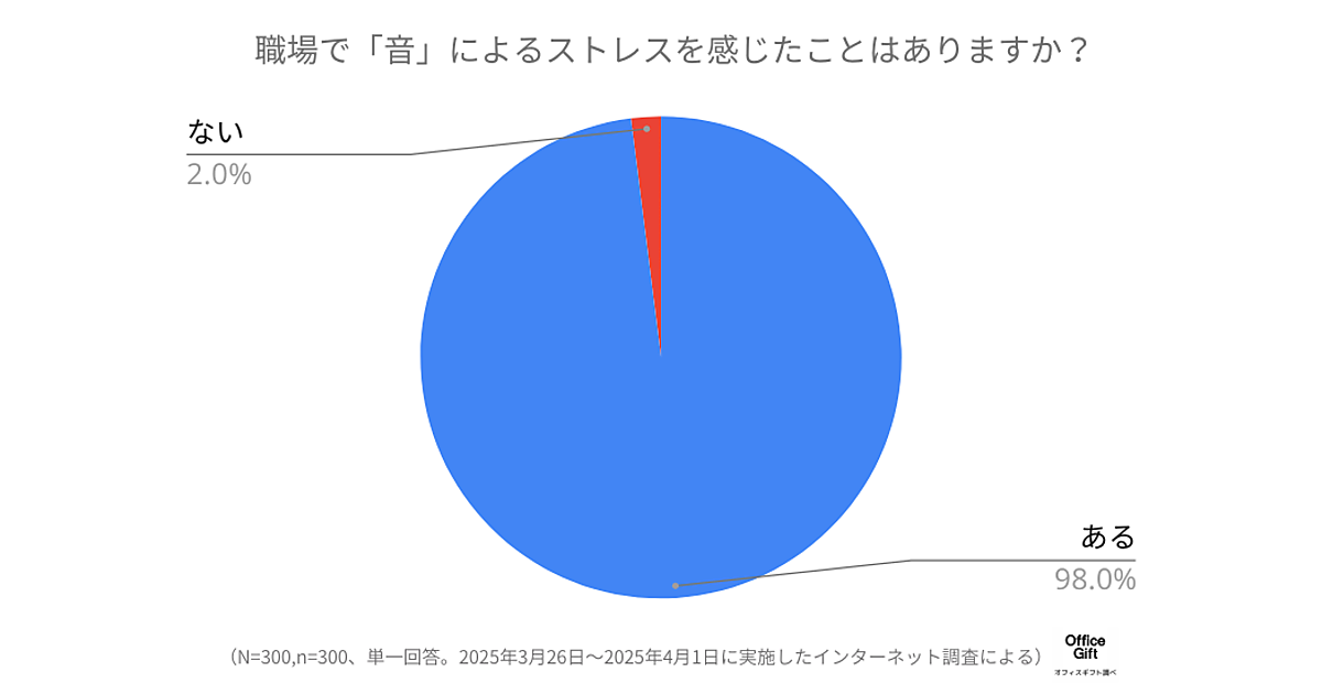 まず「職場で他人が発する音に悩まされた経験があるか」を聞くと、98%が「ある」と回答し、音ハラスメントが実は大きな問題となっていることが判明した。