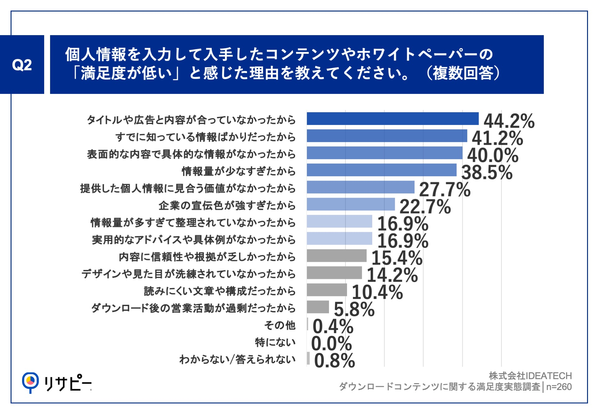 満足度が低いと感じた理由を聞くと、「タイトルや広告と内容が合っていなかったから」が44.2%、「すでに知っている情報ばかりだったから」が41.2%、「表面的な内容で具体的な情報がなかったから」が40.0%で上位となった。自由回答では、「どこにでも転がっている情報の寄せ集めだった」など厳しい意見も見られた。