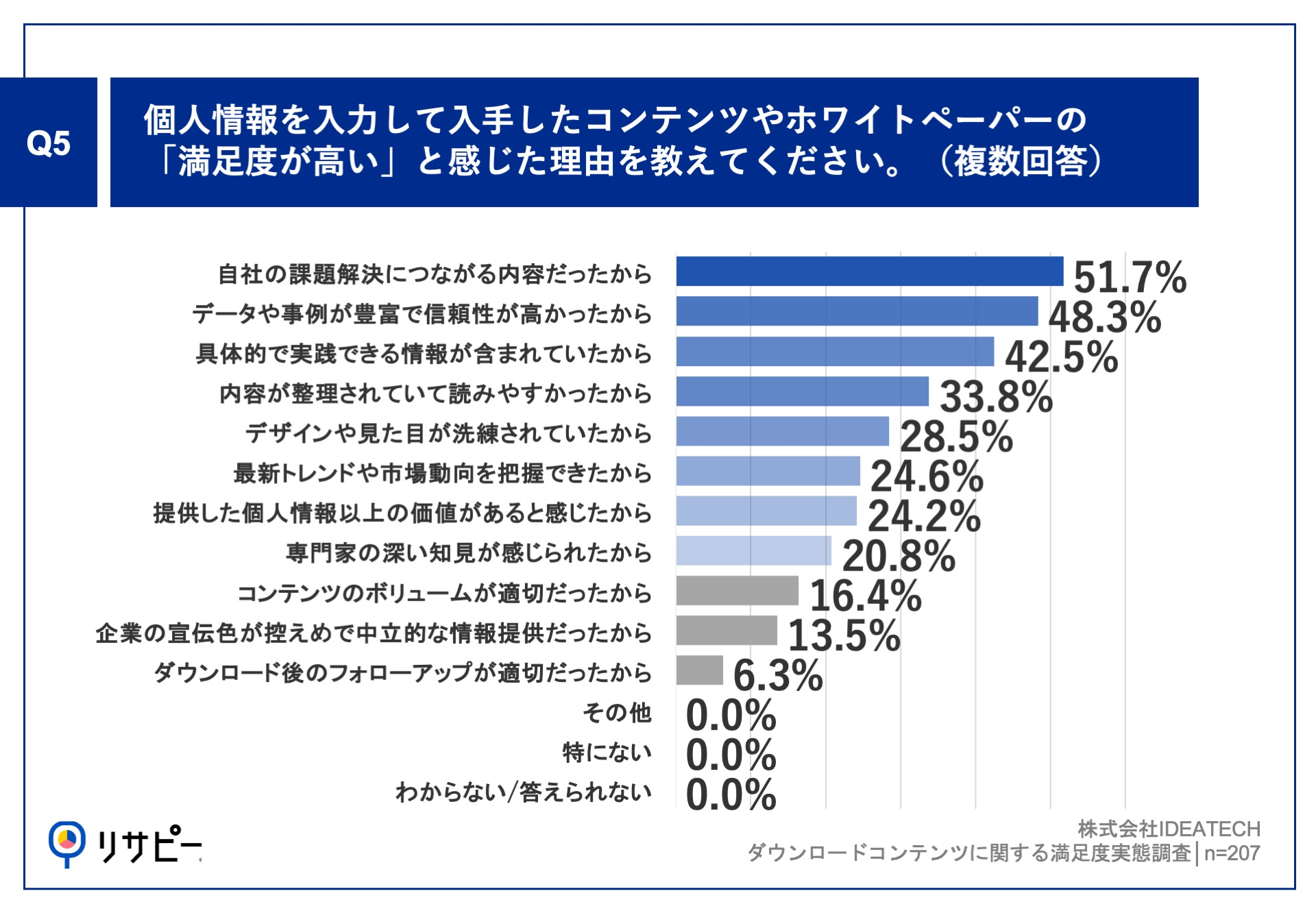 一方で、「満足度が高い」と感じた経験があるかという質問に「ある」と回答した人に対し、その理由を聞いたところ、「自社の課題解決につながる内容だったから」が51.7%で最多となった。